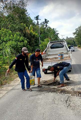 Kegiatan sosial perbaikan jalan yang berlubang dengan menggunakan semen pasir dan batu kerikil guna menutup lubang di badan serta bahu jalan.