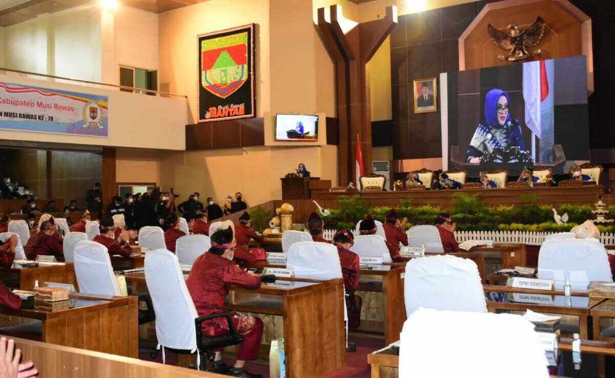Musi Rawas, JurnalTerkini.id – Rapat paripurna istimewa Dewan Perwakilan Rakyat Daerah (DPRD) Kabupaten Musi Rawas, dalam rangka hari jadi Kabupaten Musi Rawas yang ke-78 tahun. Acara tersebut digelar di gedung paripurna DPRD Musi Rawas, Komplek Agropolitan Center Kecamatan Muara Beliti, pada Selasa (20/04/2021).