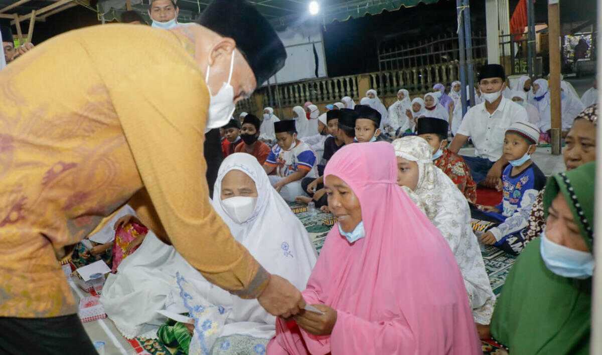 H. Surya juga menyerahkan bantuan atas nama keluarga berupa 100 sak semen untuk pembangunan Masjid Baiturrahman yang sedang direnovasi.