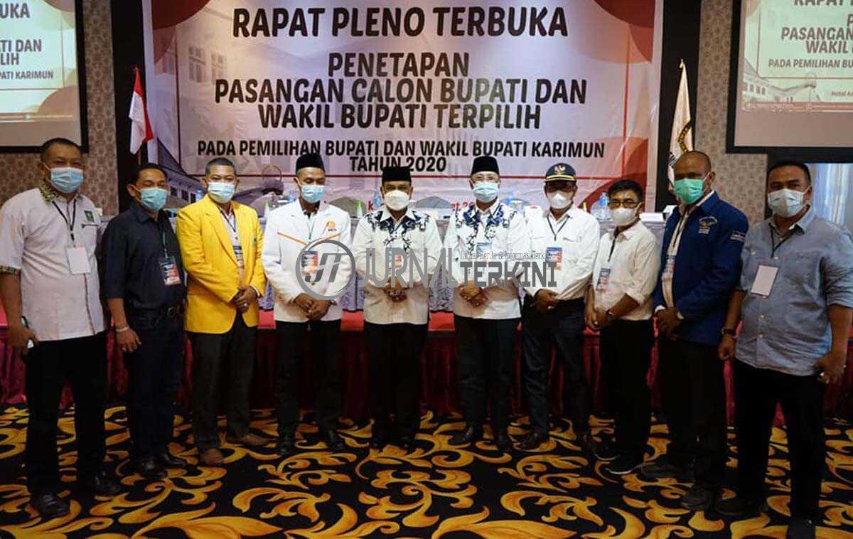 Dan KPU Kabupaten Karimun dalam rapat pleno tersebut mengumumkan hal-hal sebagai berikut : KPU Kabupaten Karimun telah menetapkan Keputusan Komisi Pemilihan Umum Kabupaten Karimun Nomor 12/PL.02.7-Kpt/2102/KPU-Kab/III/2021 tentang Penetapan Pasangan Calon Bupati dan Wakil Bupati Terpilih dalam Pemilihan Bupati dan Wakil Bupati Karimun Tahun 2020 tertanggal 21 Maret 2021.