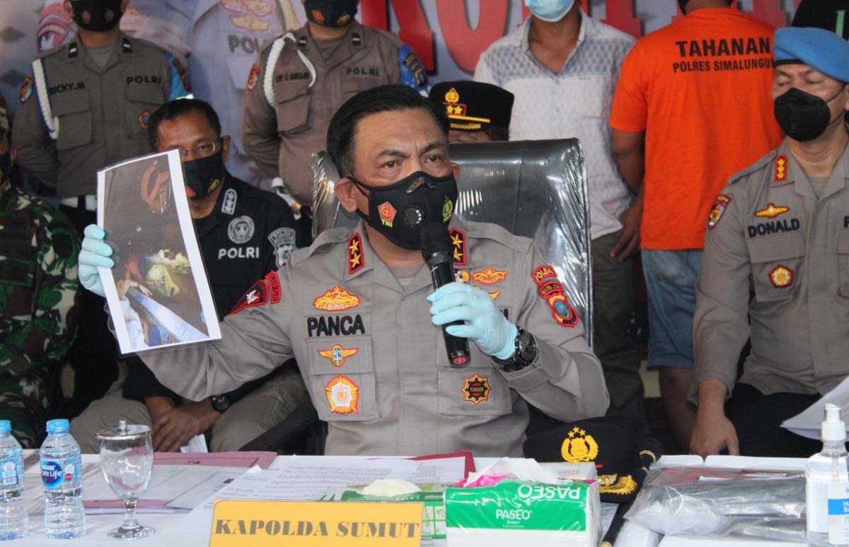 Kapolda Sumut Irjen Pol R.Z Panca Putra Simanjuntak, Msi memaparkan hasil pengungkapan tindak pidana pembunuhan Marsal Harahap yang terjadi pada Jumat (18/6/2021) sekira pukul 23.30 WIB sesuai Laporan Polisi Nomor : Lp/ B/ 391/ Vw 20217 Spkt/ Polres Simalungun/ Polda Sumatera Utara tanggal 19 Juni 2021 (TKP) Di Jalan Umum Huta VII Desa/Nagori Karang anyer Kecamatan Gunung maligas Kabupaten Simalungun.
