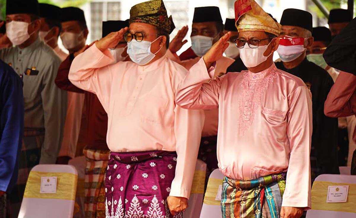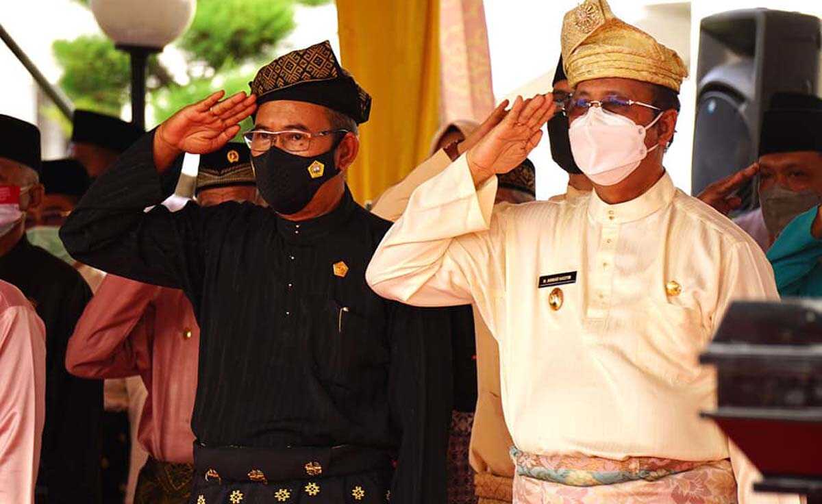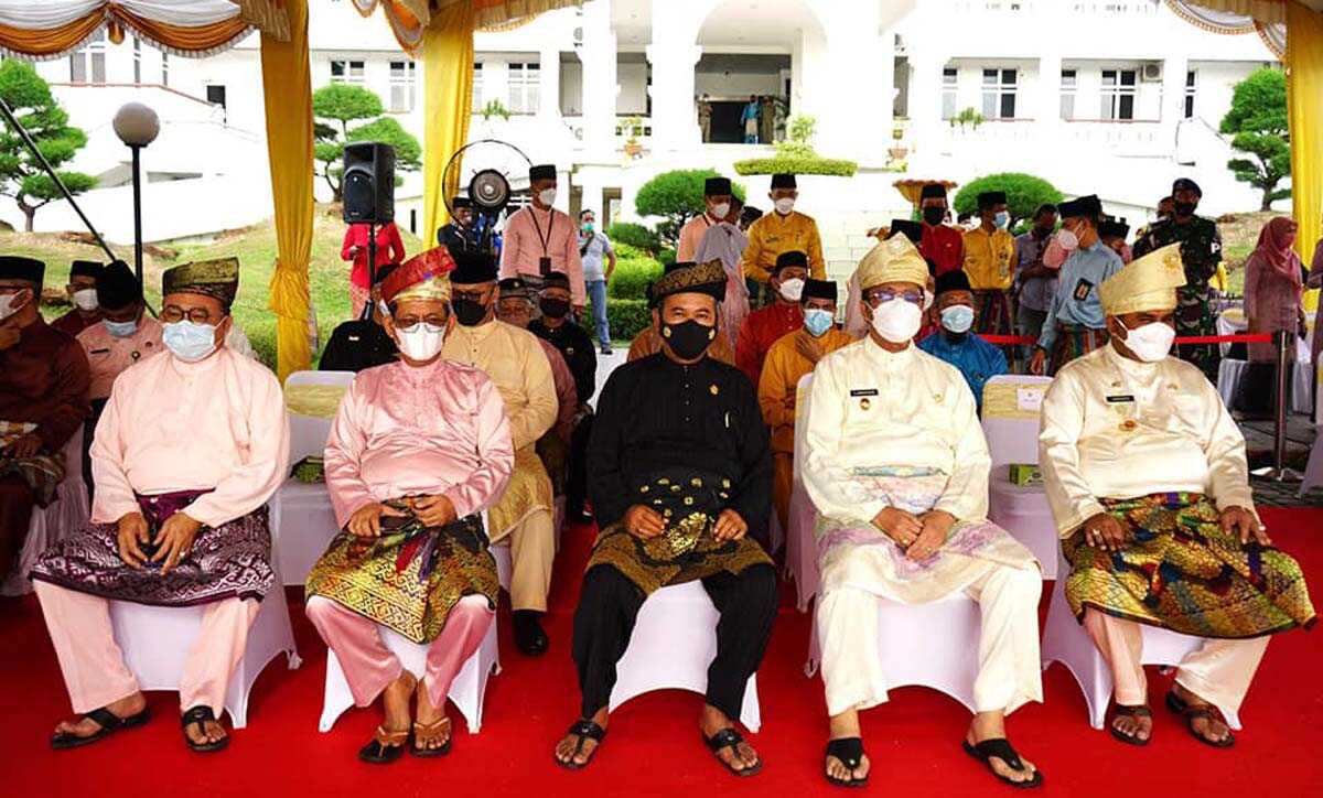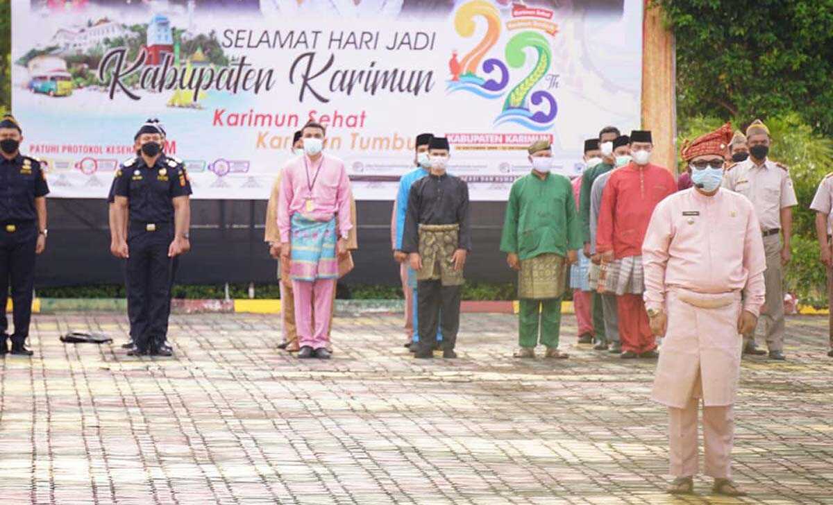 Peringatan HUT ke-22 Kabupaten Karimun, jauh dari hiruk-pikuk kerumunan akibat pandemi Covid-19, melalui sambutannya, Bupati Karimun Aunur Rafiq juga mengirim pesan kesederhanaan di balik baju kurung Melayu yang dikenakan peserta upacara yang hadir dengan jumla terbatas.