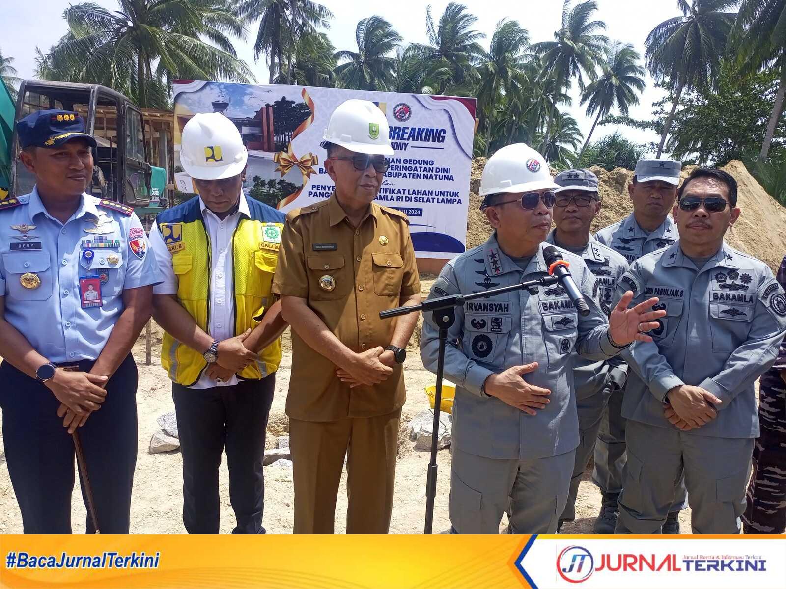 Natuna, JurnalTerkini.id – Kepala Badan Keamanan Laut (Bakamla) RI Laksdya TNI Dr. Irvansyah, S.H., M.Tr.Opsla., melaksanakan ground breaking atau meresmikan pembangunan Kantor Sistem Peringatan Dini (SPD) Bakamla RI Natuna. Kepala Bakamla juga menyerahkan sertifikat lahan Selat Lampa, di Desa Tanjung Bunguran Timur Laut, Kabupaten Natuna, Provinsi Kepulauan Riau, Selasa 23 Juli 2024.