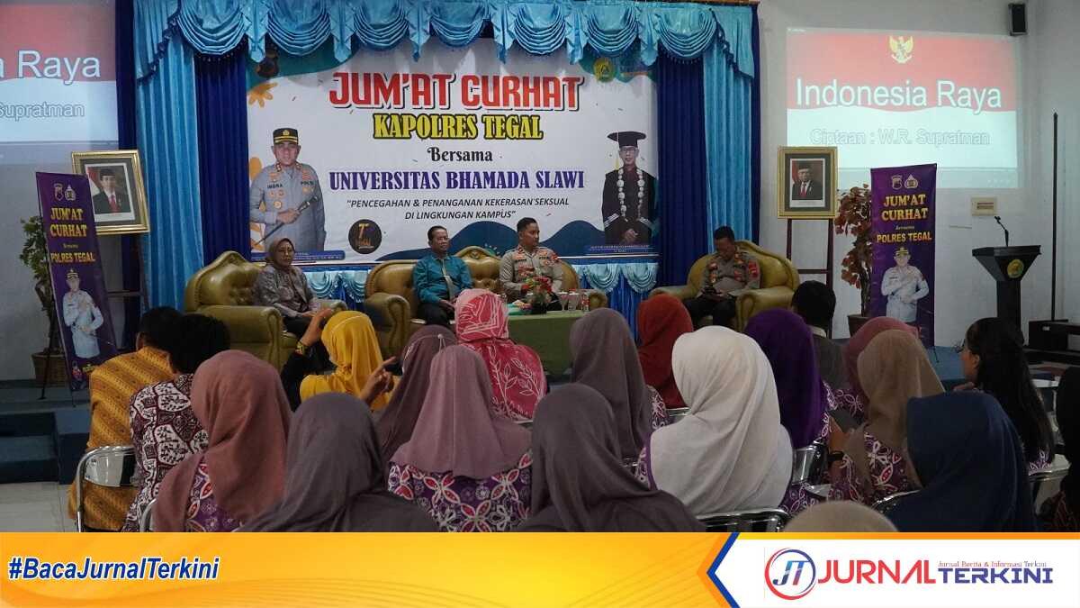 TEGAL, JurnalTerkini.id – Kepolisian Resor (Polres) Tegal Provinsi Jawa Tengah menggelar kegiatan Jumat Curhat untuk mendengarkan keluhan masyarakat yang bertempat di Aula Universitas Bhamada Slawi.