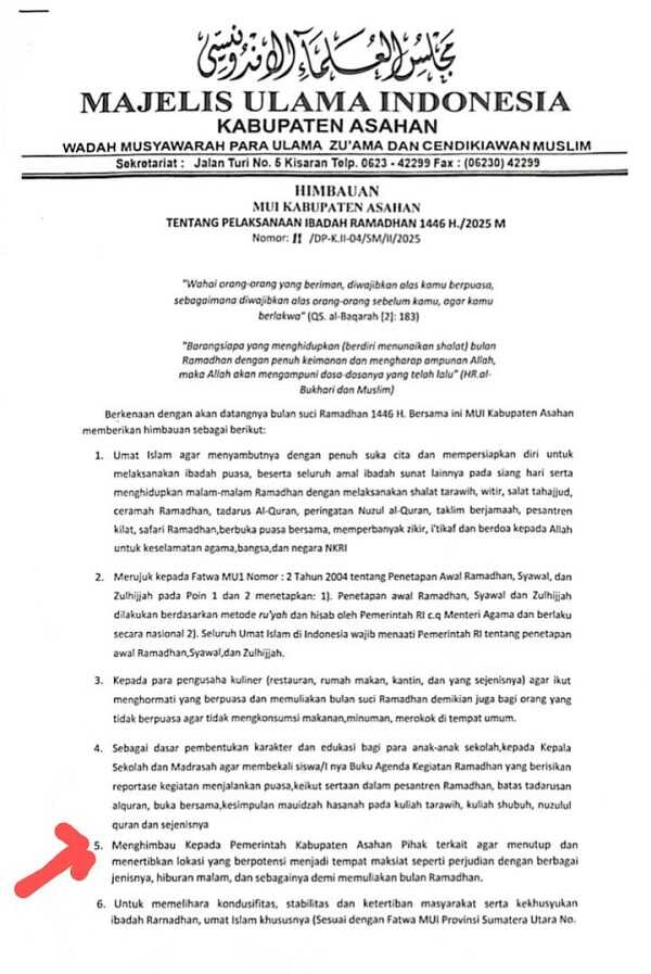 “Mengimbau kepada Pemerintah Kabupaten Asahan, Pihak terkait agar menutup dan menertibkan lokasi yang berpotensi menjadi tempat maksiat seperti perjudian dengan berbagai jenisnya, hiburan malam, dan sebagainya demi memuliakan Bulan Suci Ramadhan,” bunyi poin ke-5 dari imbauan tertanggal 19 Februari 2025 itu.