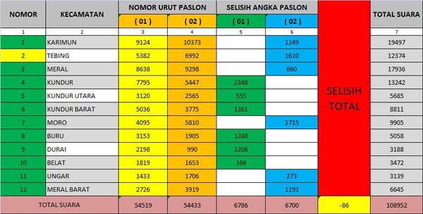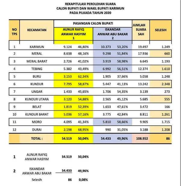 Berikut hasil penghitungan suara Pilkada Karimun di 12 Kecamatan: